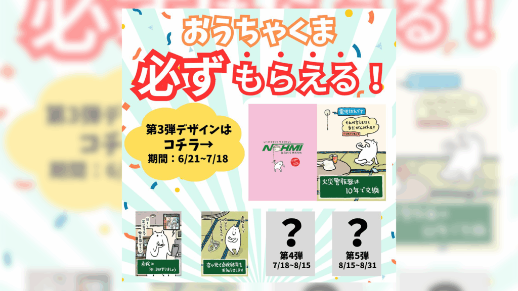 📣住宅用火災警報器「点検キャンペーン第3弾」🐻❄️#いつかやろうを今すぐやろう本日6月21日(土)から #おうちゃくま 第3弾デザインの応募がスタート🐻❄️✨↓↓↓【おうちゃくまクリアファイルプレゼントに応募される方へ】◾️第3弾 開催期間◾️ 2025年6/21(土)〜2025年7月18日(金)… pic.twitter.com/XVKNmDzg86— 能美防災の火災警報器【公式】 (@NOHMI_JYUKEIKI) June 21, 2025